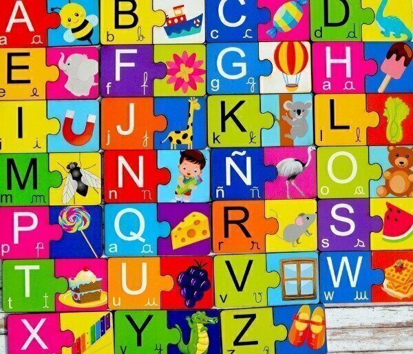 Contiene 54 piezas de madera laminada (27 con letras con el abecedario completo y 27 con imágenes).